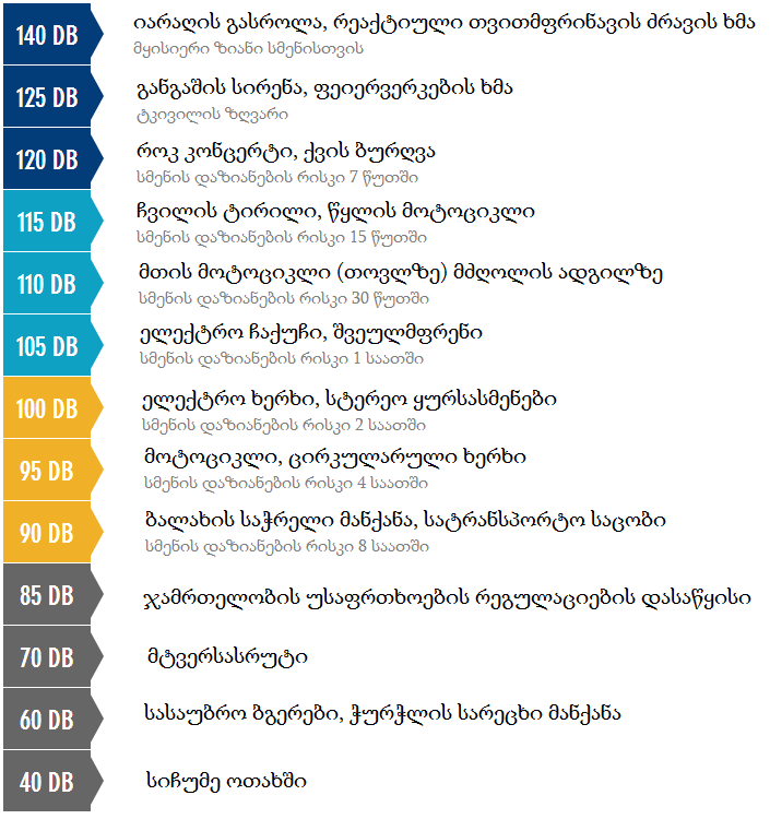 ექსპერტების აზრით, 85 დეციბელზე ზემოთ ხმა არის საშიში. ეს კი იმას ნიშნავს, რომ მოტოციკლეტების, ყურსასმენებისა და ბალახის საჭრელი მანქანის ხმებს შეუძლია პერმანენტული სმენის დაქვეითების გამოწვევა.